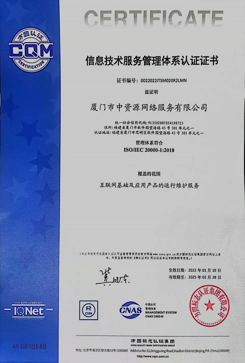 CQM信息技術(shù)服務(wù)管理體系認(rèn)證ISO/IEC 20000證書(shū)