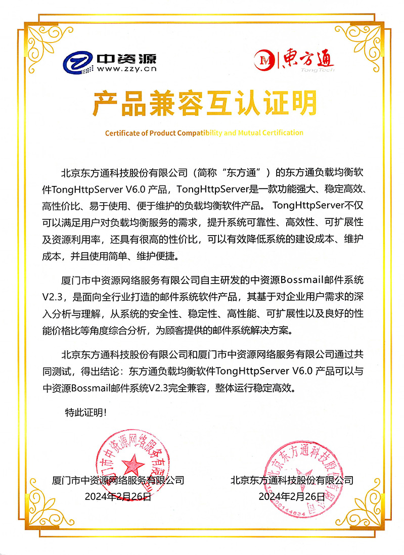 【國(guó)產(chǎn)化】東方通產(chǎn)品兼容互認(rèn)證證明